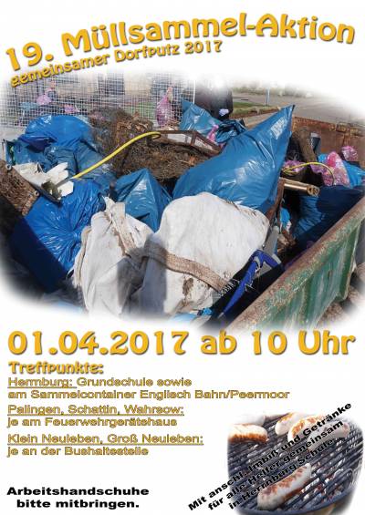 Zu den bewährten Helfern und Unterstützern des Dorfputzes zählen wieder u.a. der SF Herrnburg, die CDU Lüdersdorf, die Jägerschaften Schattin und Herrnburg, die Feuerwehren Palingen, Herrnburg, Schattin sowie Neuleben/Boitin-Redorf - jeweils auch mit ihren Jugendwehren bzw. den Feurwehrfördervereinen. Auch der Landwirtschaftsbetrieb Lüdersdorf wie auch der Fanfarenzug Lüdersdorf e.V. bringen sich aktiv mit ein. Insgesamt hoffe ich auf rege Beteiligung mit auch neuen Helfern und darf versprechen, dass es hinterher ab ca. 12.30 h gemeinsam an der Grundschule Herrnburg Würstchen vom Grill sowie kühle Getränek zur Stärkung geben wird.